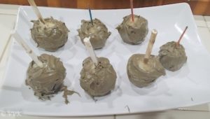 - After 30 minutes, remove the cakepops and slow apply this frosting using a spoon (or even your hand) and smoothen it. Kids will enjoy this process. You have to be careful while applying this. If the cake pops are not set there is a good change for it to break.