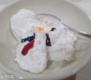 For this recipe, I went with artificial food color. I just used a drop of few colors but you can replace it completely with natural fruit flavors or with rose essence or instead of whipping cream, you can melt chocolate and use that as outer layer. I didn’t intend to add all the colors. I wanted different and unique colors for my cake pop. But Vaandu, who was helping me with this recipe, didn’t want it that way. (I exclusively prepared this for him, so I decided to go in his way) He wanted to experiment with the colors. So we combined all the colors and got this khaki brown color. As cold whipping cream is easy to handle for Vaandu, I went with that instead of melting chocolates. Have fun preparing this with your little ones in your own way.