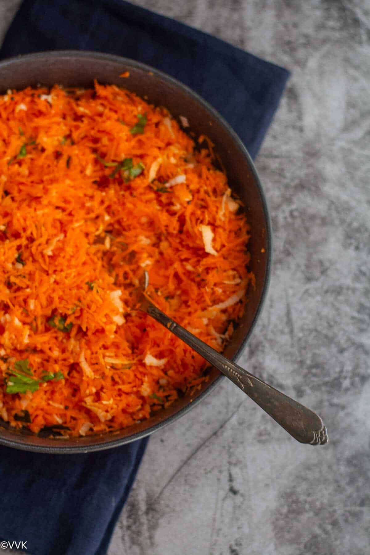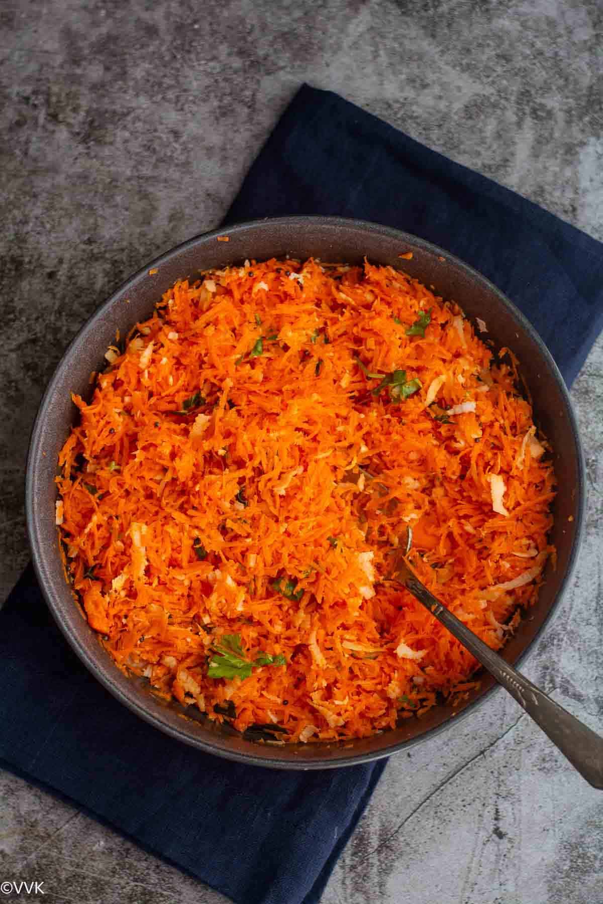 - In a bowl, combine the grated carrot, coconut, cilantro, salt, and lime juice.