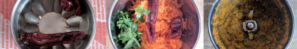 - Grind together the carrot, soaked red chili with water and cilantro together into a smooth paste.