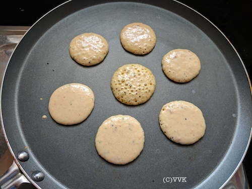 I do not carry mini uttapam pan/tawa. I just use my regular dosa tawa to prepare this dosa. And I use the one tbsp measure spoon to scoop the batter. I drop about 1 tbsp batter on the tawa, and I don’t spread them out. So basically I make about six to seven coin dosas /uttapam at a time like below.