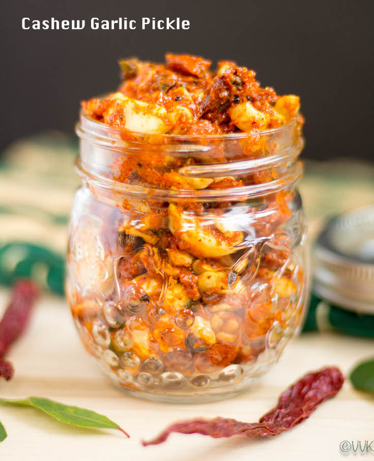 - If you don’t prefer raw garlic cashew, Dry roast cashew without any oil until golden brown Saute garlic in about 1 tsp of oil until it is golden brown. Add these to the pickle mix.