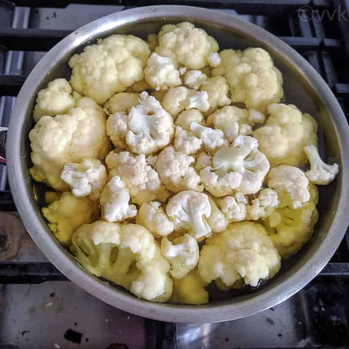 - Bring 4 cups of water to boil. Add ¼ tsp salt and ¼ tsp turmeric powder to this water. When the water comes to boil, turn off the heat. Now add the cauliflower florets and let it sit for 5 minutes. Make sure the cauliflower is entirely inside the water.
