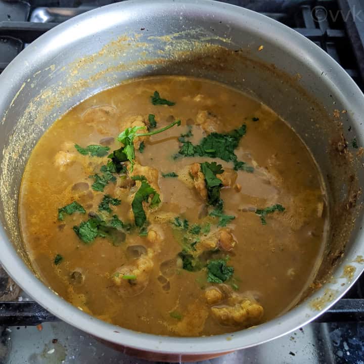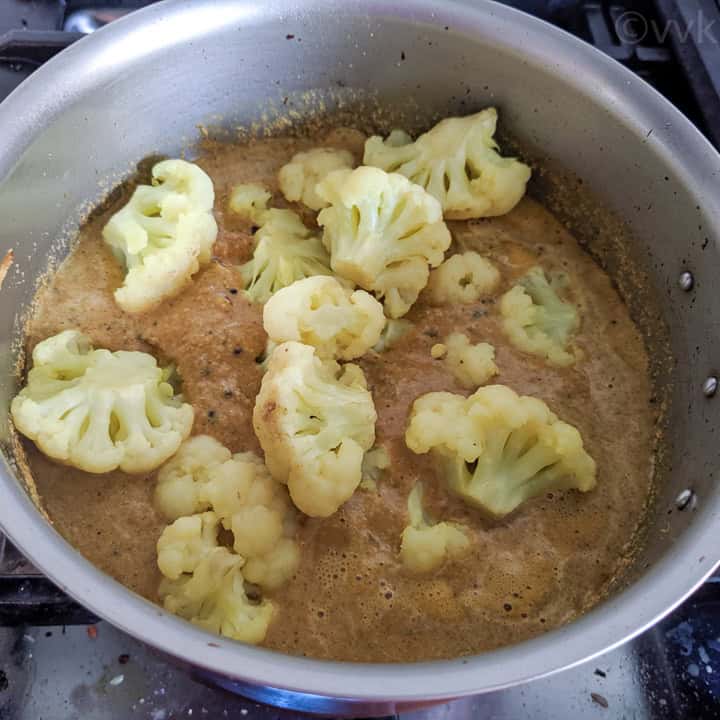 - Now add cauliflower florets and one more cup of water. Reduce the medium-low and cook until the cauliflower florets are soft and tender, for about 8 to 10 minutes. I usually reduce the heat to low and slow cook it for 15 minutes. The gravy will thicken as we are adding roasted gram. So adjust water accordingly and as per your consistency preference.