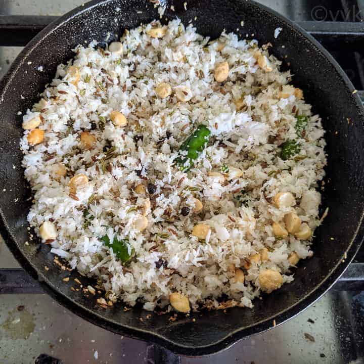 - Heat a pan and add 1 tsp of coconut oil. When it is hot, add the green chilies, cumin seeds, black peppercorns, and roasted gram. Fry over medium heat for 30 seconds and then add the poppy seeds and fennel seeds. Reduce the heat to medium-low and roast until the spices are fragrant. Turn off the heat and add the coconut. Mix it well and allow it to cool.