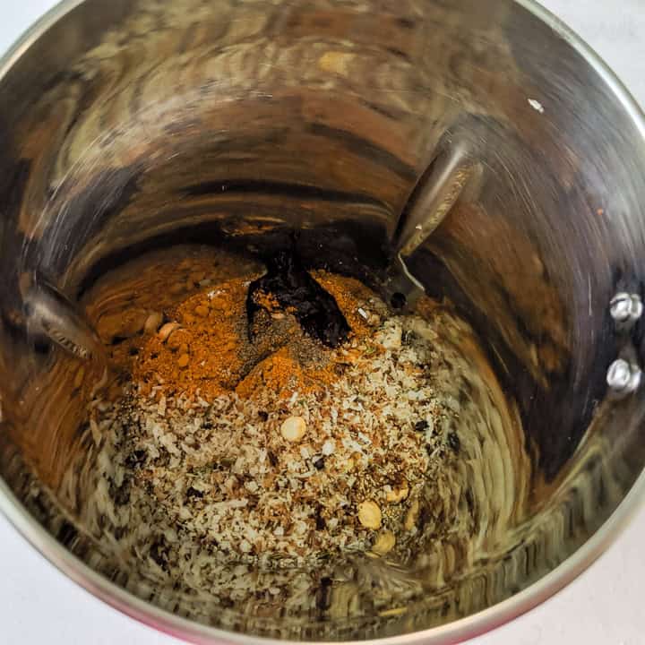 - Add the roasted spice mix into a mixer jar. Add the sambar powder, tamarind paste, and kalpaasi if used into the mixer jar.