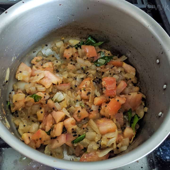- Now add the tomato and cover and cook until the tomatoes are soft and mushy.