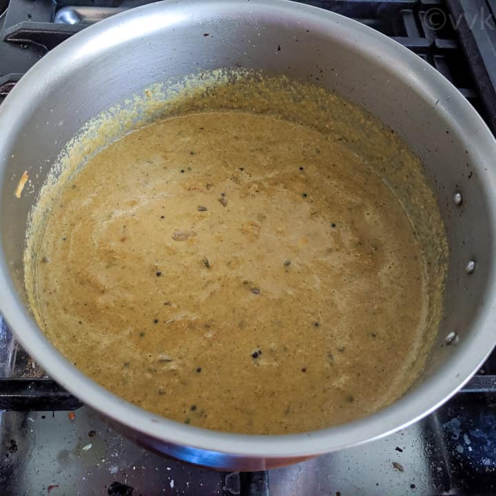 Usually, for kuzhambu (South Indian tangy tamarind-based stew), we add sambar powder and tamarind. For kurma (South Indian coconut-based gravy), we add fennel and coconut, roasted gram, and other masala items. For this recipe, we add both sambar ingredients and kurma ingredients. We skip cardamom, cloves, and cinnamon, though.