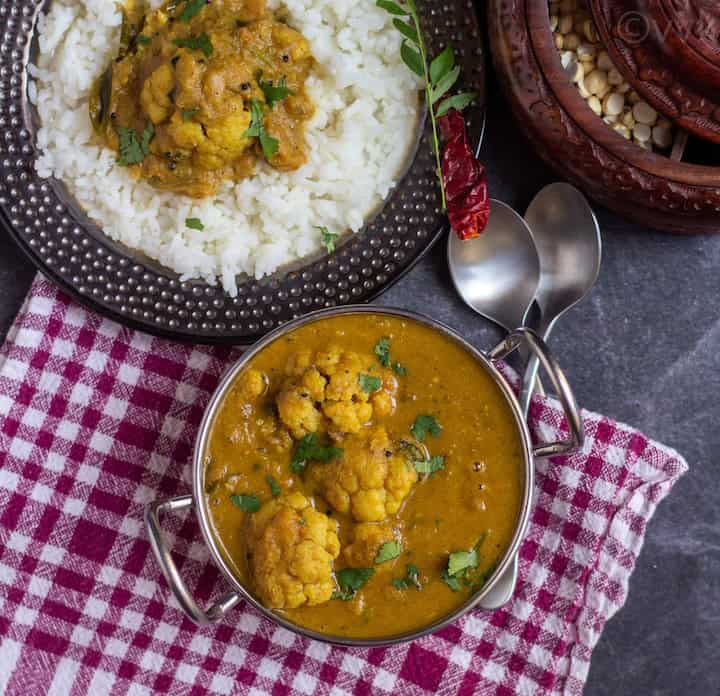 Here is a lip-smackingly delicious gravy from the Chettinad cuisine – cauliflower kurma kuzhambu – a delicious coconut-based curry with cauliflower. A perfect side for both rice and roti.
