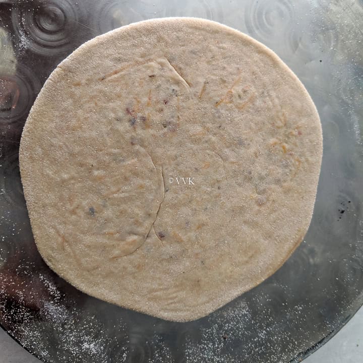 - Now using the rolling pin, evenly roll the paratha into 6 to 7-inch circle. The paratha dimensions are to provide a rough idea. Depending upon the dough size and your preference, roll them. Also, you can roll into triangles or squares as well. Apply equal pressure when rolling. That’s something that I learned from my friend. Shake off the excess flour.