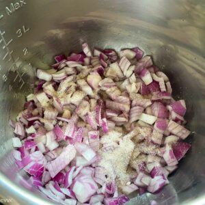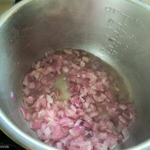 - Set the Instant Pot in the saute mode and add the oil. When the oil is hot, add the chopped onion and salt. Mix well. Adding salt will ooze out water, and that’s fine. It helps to prevent the burn signal and the onions from browning and sticking to the bottom.