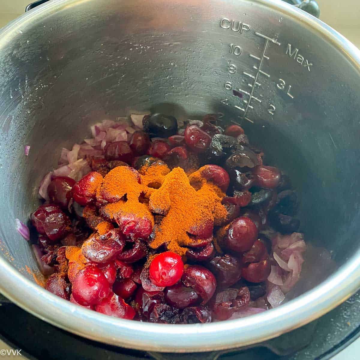 - Turn off the Instant Pot and add the cherries, paprika, and 2 tbsp of water.