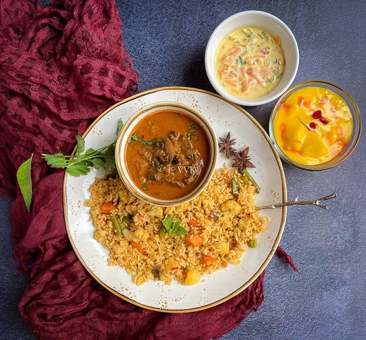 A delectable Chettinad vegetable biryani platter that’s hard to resist. Here is my Chettinadu biryani served with mushroom gravy, sauteed carrot, and onion raita, and microwave fruit custard.