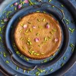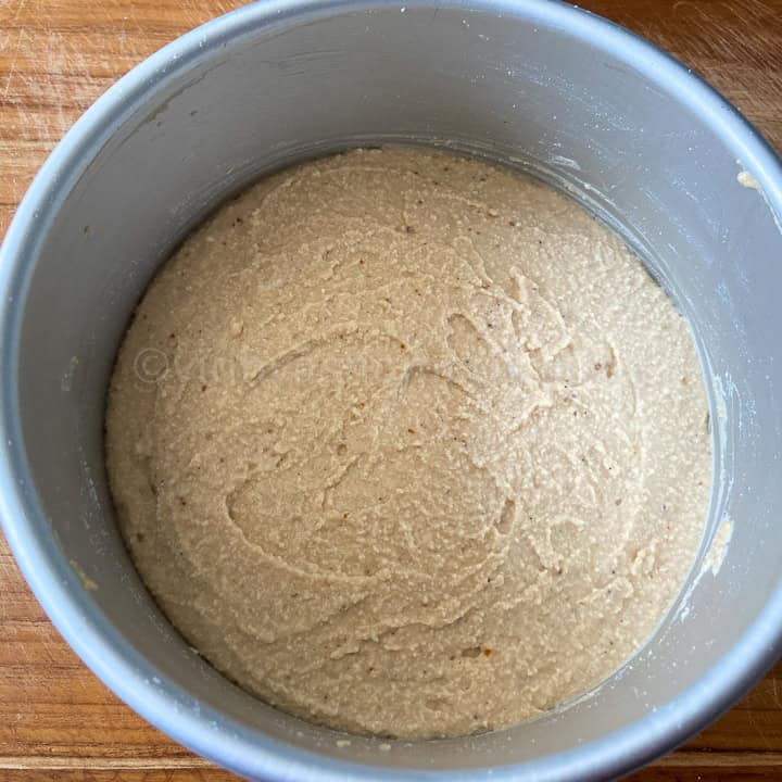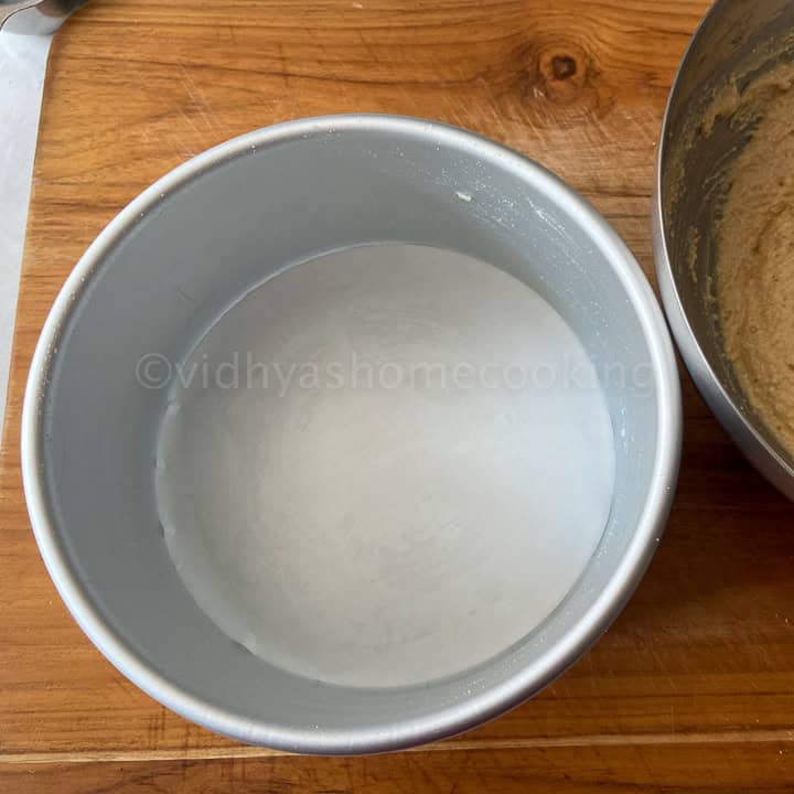 - Grease a cake pan with ghee and line the bottom of the pan with the parchment paper if using. I used my 6-inch round cake pan.
