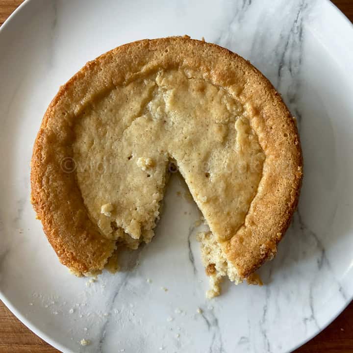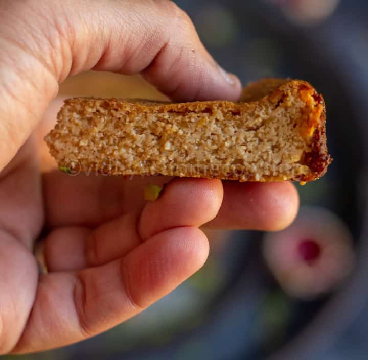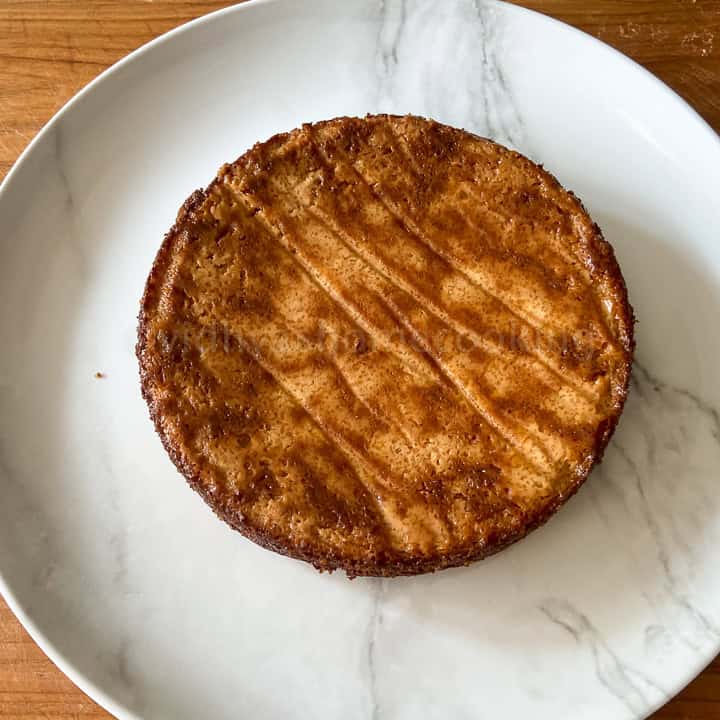 Ok, this time, I tried again with unstrained ricotta cheese but with jaggery and unroasted fine semolina. As we are trying to include more jaggery, I decided to go with jaggery. I am sharing this version of the chhena poda here on the blog today. As I didn’t strain the cheese, I ended up baking it for 45 minutes and turned off the oven but let the cake sit in the residual heat for 10 minutes. You can bake up to 55 minutes but not more than that for this measure.