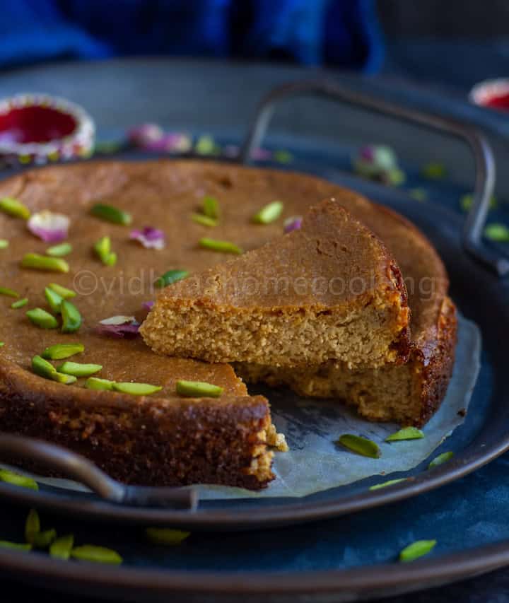 The main thing about this recipe is you can’t go wrong with it, and it is very forgiving. I have played with the ingredients like using sugar instead of jaggery and strained ricotta cheese instead of using it directly and using different semolina/sooji varieties. And all the time I got a delicious cake without any fail. The baking temperature, of course, varies but other than that, no issues.