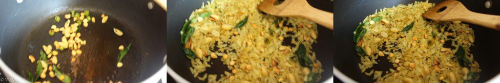 - Then add the cashews, daliya, peanuts and also turmeric powder and sauté for couple of minutes in medium heat.