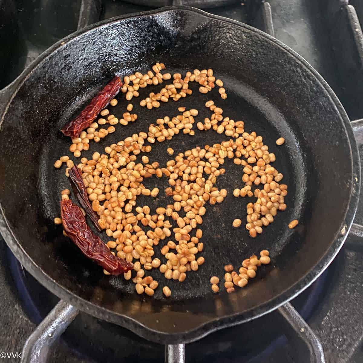 - Heat a pan or kadai and add ½ tsp of oil. When the oil is hot, add the urad dal, dried red chili, asafoetida, and roast until the urad dal turns a deep golden color over medium-low heat. Transfer it to the mixer jar and set it aside.