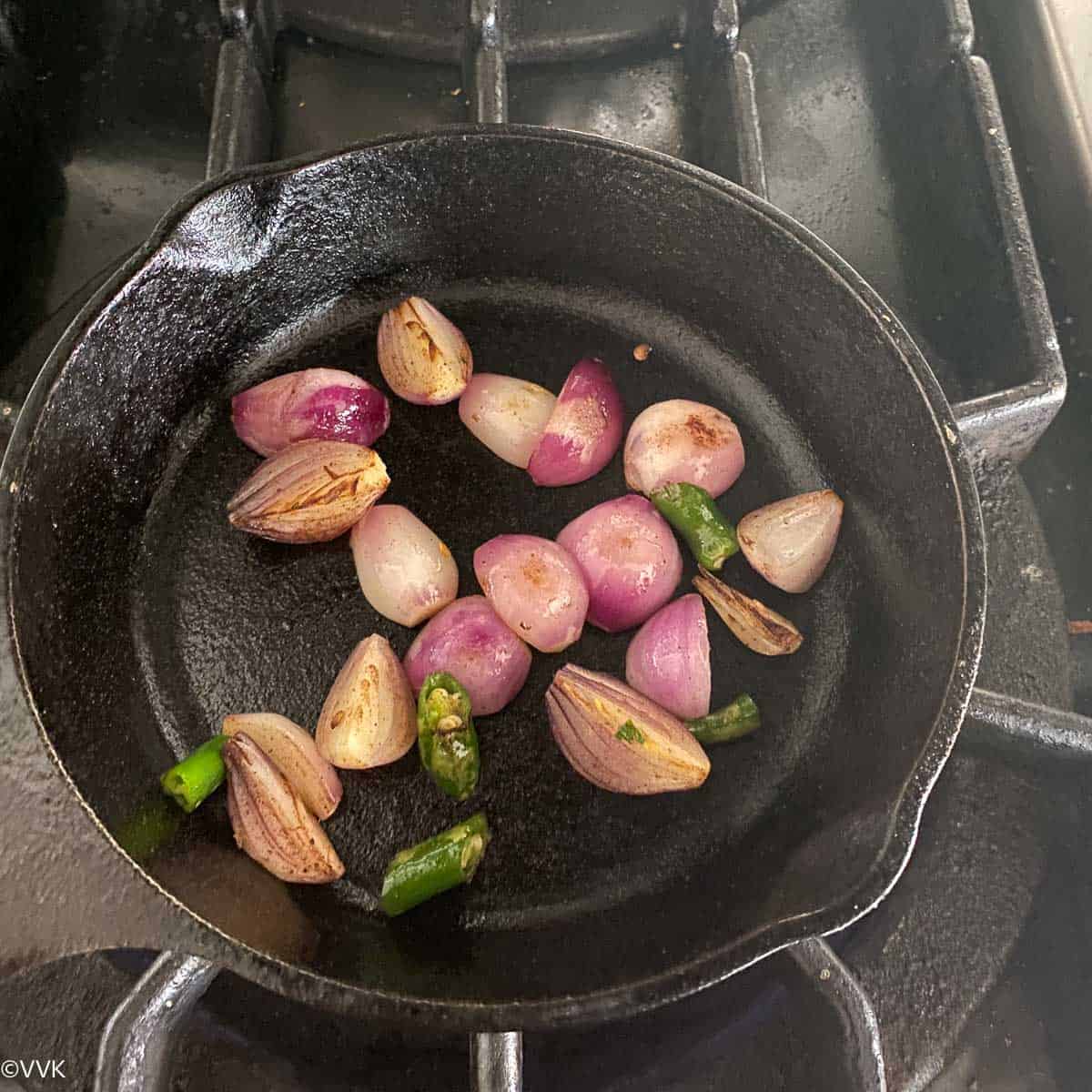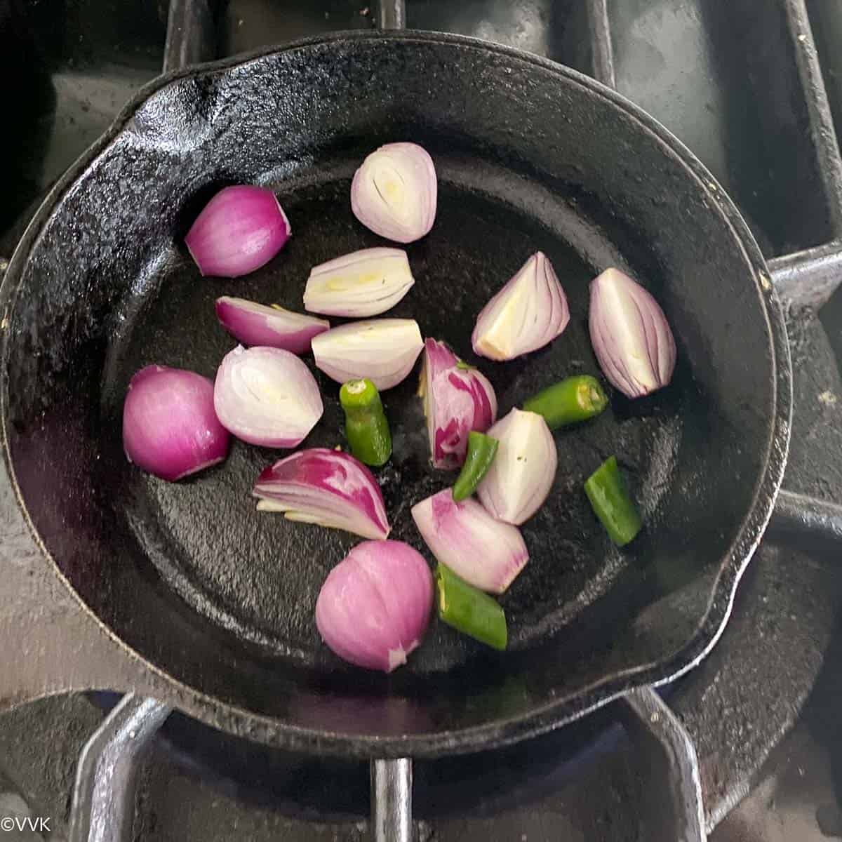 - Add the remaining ½ tsp oil to the same pan and add the shallots and green chilies.