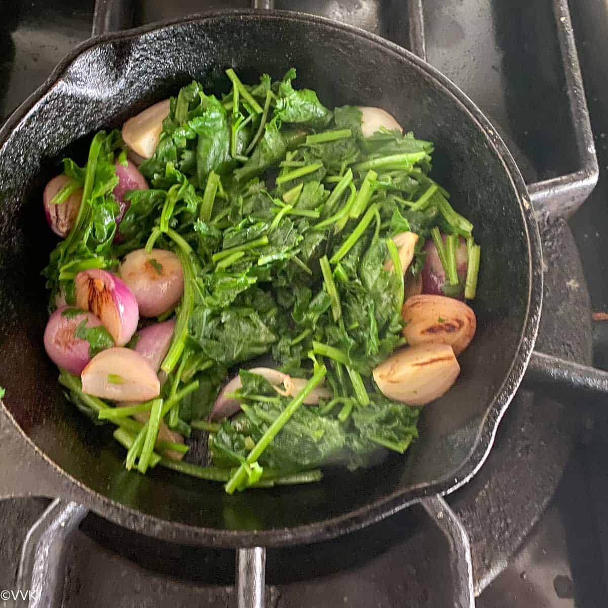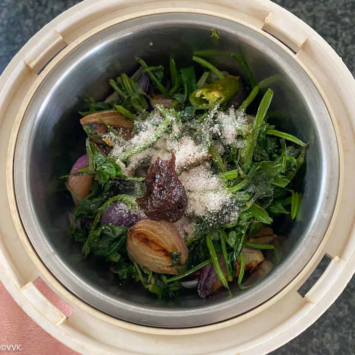 - Reduce the heat to low; add the roughly chopped cilantro and mix well. Once it starts to wilt, turn off the heat and let it wilt further in the residual heat. Transfer this to the mixer jar.