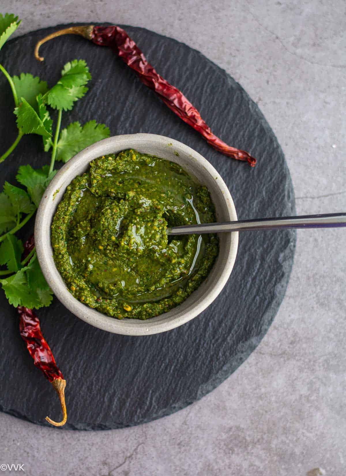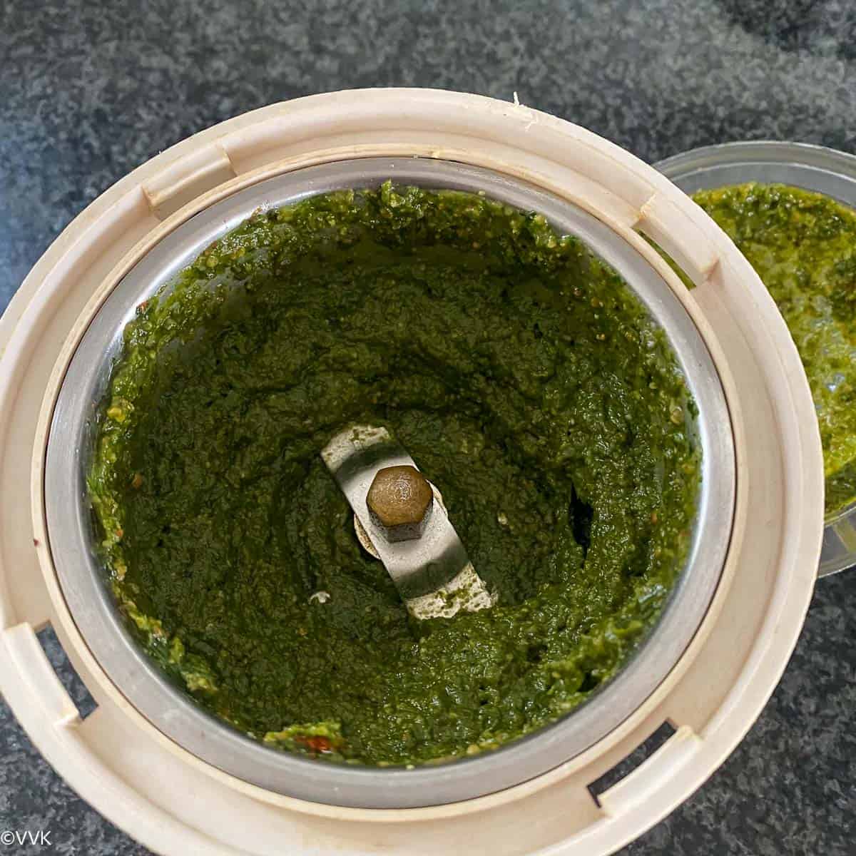 - Without adding water, grind the ingredients smooth, and that’s it; the cilantro shallots chutney is ready.