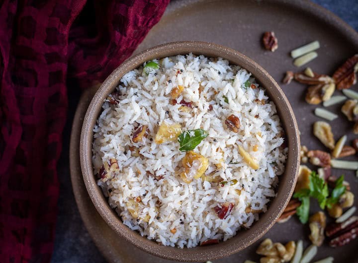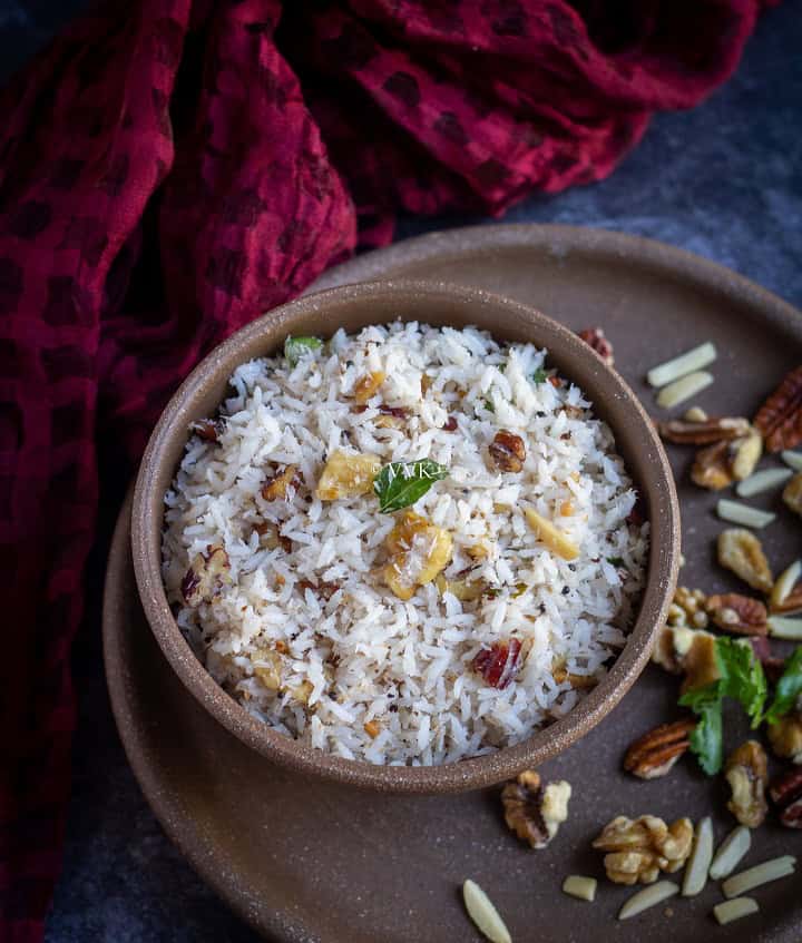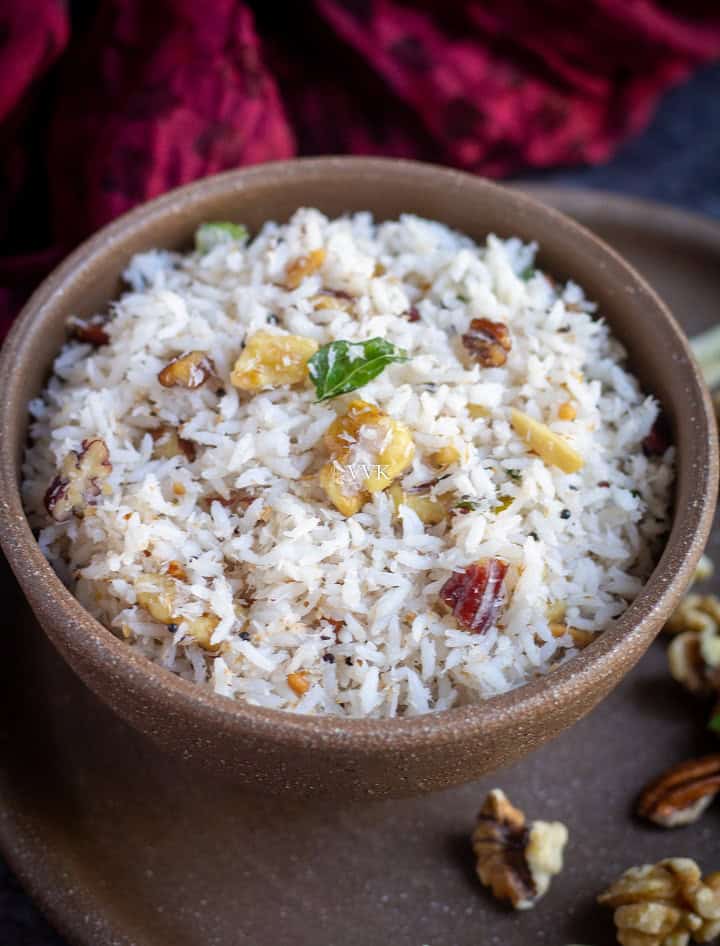✔ Nuts – While we add peanuts to lemon rice, in our house, we add cashews to coconut rice. But I went with walnuts, pecans, and slivered almonds today. It adds a nice crunch to the coconut rice. You can add nuts of your choice, and the measure is also wholly up to you.