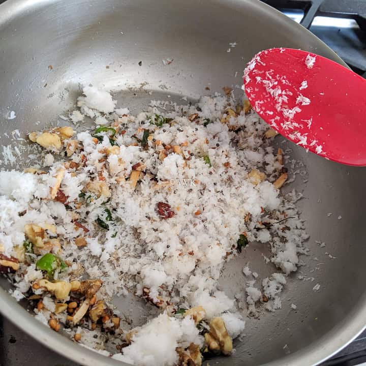 - Now add the coconut and reduce the heat to medium-low and roast the coconut until it turns light brown. Then turn off the heat.