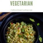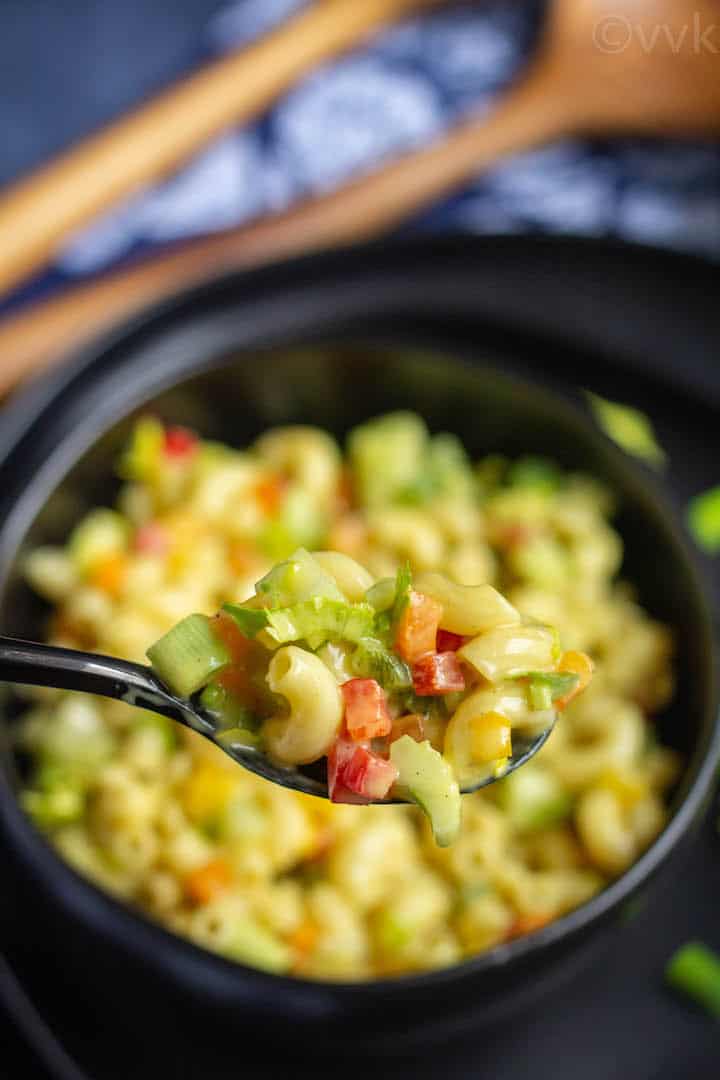 Our friend made it just with veggies, but in grocery stores and other places, you can different varieties of this cold macaroni salad—some with tuna, some with bacon, and some with eggs. You can find a zillion varieties on the internet as well. I loosely adapted the recipe from all recipes website. Here is my vegetarian and egg-free take on this pasta salad.