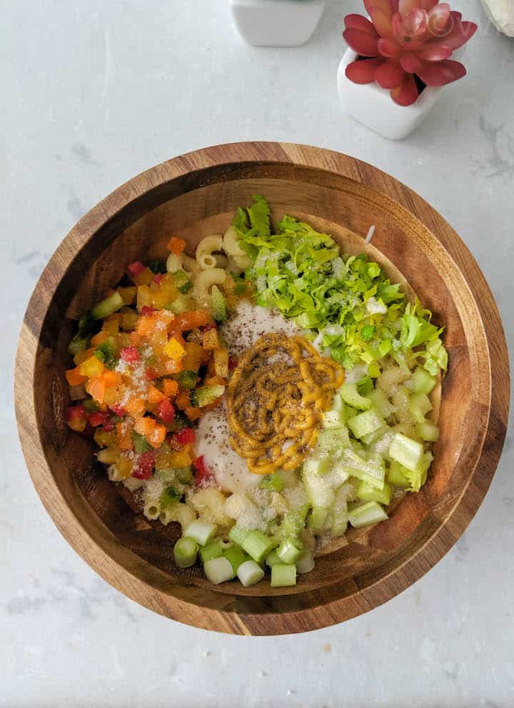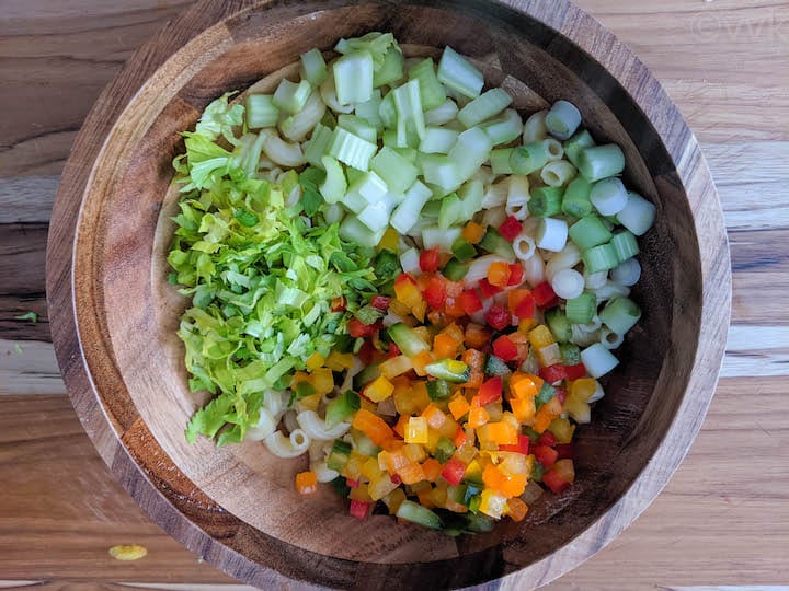 I always use a mix of colored bell peppers, green onion, and celery along with celery greens. My son is not a fan of raw onions, so I add green onions. Also, he loves the crunchiness of celery in this salad. So I make sure to sneak in celery along with the greens. Now, there is no set measure for vegetables. You can adjust the measurements according to your preference. Also, instead of green onion, you can add red onion and other veggies like carrots, sweet peas, sweet corn, snap peas, sweet pickles as well.