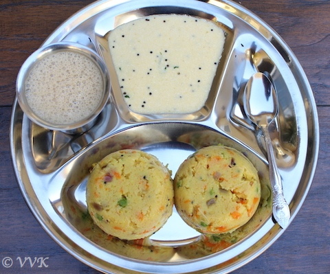 Kichadi is prepared with sooji and semiya (in lesser quantity) and it is also loaded with veggies. (Not to confuse with the North Indian Style Kichadi) I am a big fan of Saravana Bhavan’s Rava Kichadi. Yummmm. I usually order Rava Kichadi every time I go there. Also, I like the kichadi they serve in weddings. Rava kichadi and kesari are one of the staple tiffins in Tam-Bram weddings.