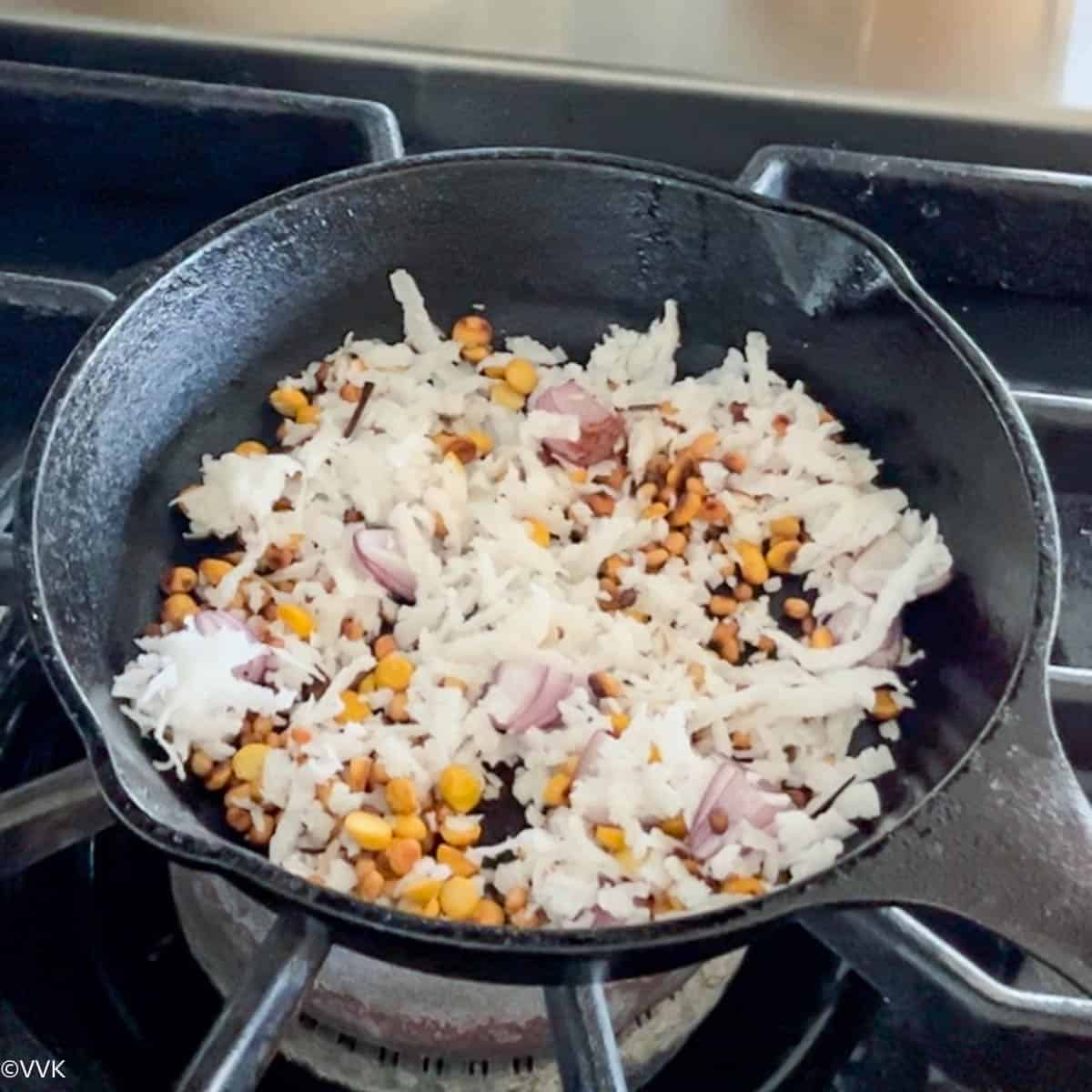 - Now add the coconut and mix. Turn off the heat and let the coconut roast in the residual heat. Transfer the dal and shallots to the mixer jar.