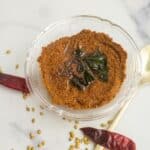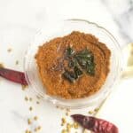 If you check the ingredients, you will find it very similar to the arachuvitta sambar masala- except for tamarind. Sometimes, I make it in bulk, freeze a small portion, and add it to sambar or dal. If I plan to serve it with rice, I grind it with minimal water and keep it thick like in the picture. If I plan to serve it with idli or dosai, I dilute it with water and make it slightly thin. The tangy and spicy flavor makes this chutney perfect with leftover rice porridge, bajra gruel, or even matta rice kanji.