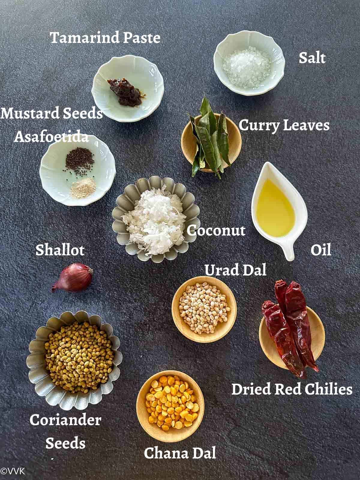 The main ingredients are coriander seeds, urad dal, chana dal, tamarind, salt, and dried red chilies. To enhance the flavor, we need curry leaves, shallots, and coconut. We also need oil to roast and temper the mustard seeds.