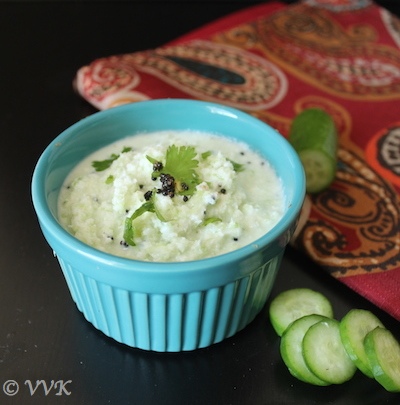 Cucumber Curd Raita | Vellarikkai Pachadi – A simple cucumber-yogurt relish with grated cucumber and freshly ground coconut paste! A great side for biryanis and variety rice.