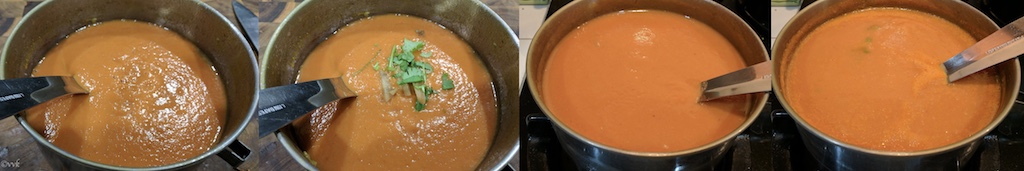 - Add this puree to a heavy bottom pan and add ginger juliennes and chopped cilantro. Let it simmer in low heat.