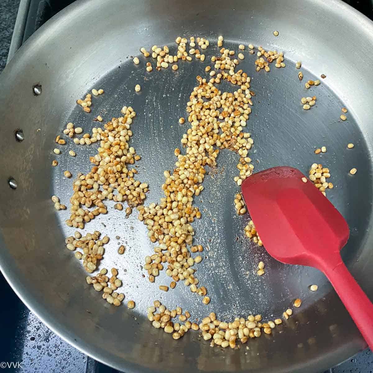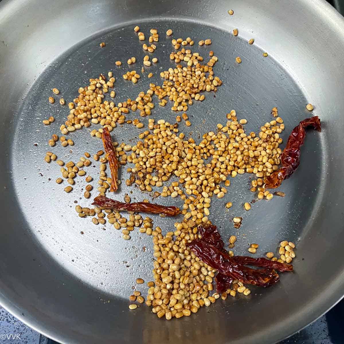 - When it turns light golden brown, add the dried red chilies and roast until the urad dal turns deep golden brown and the chilies become crisp.