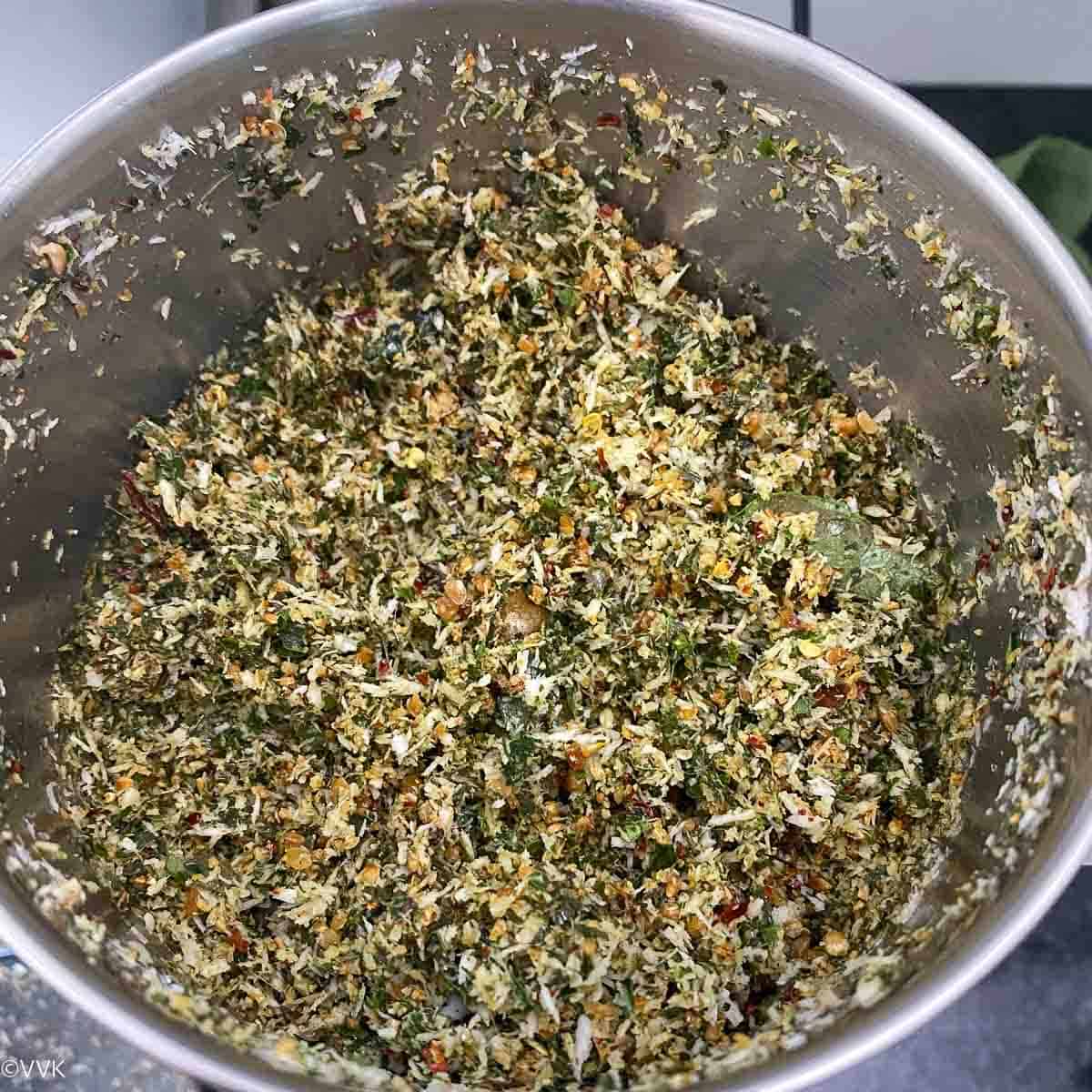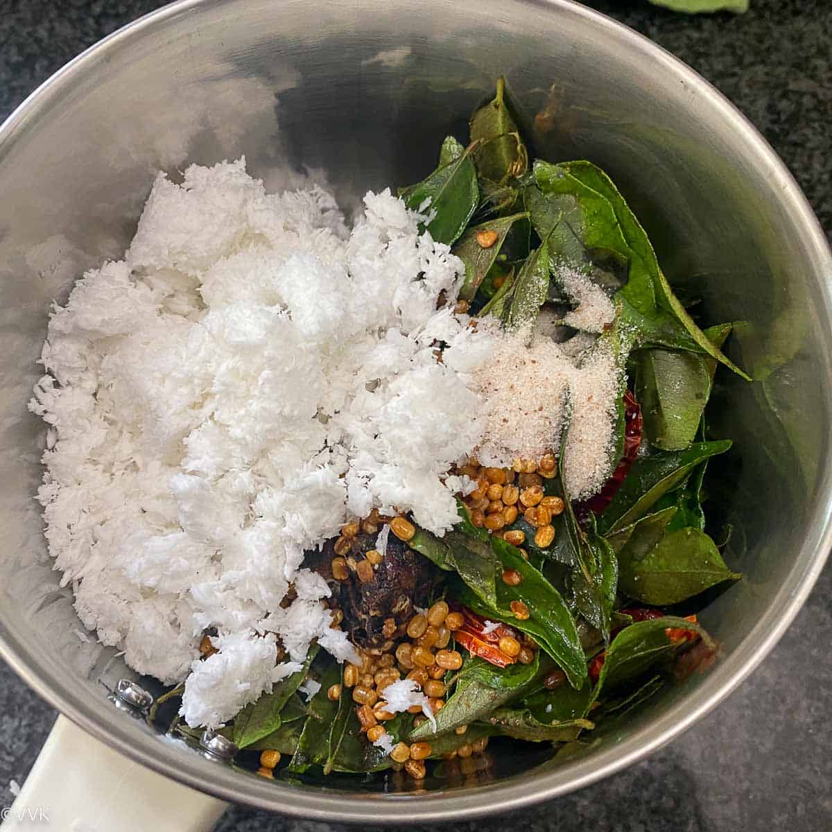 Curry leaves: It’s the key ingredient. We need approx 1 cup of curry leaves. Tender ones work best as they are less fibrous. But, there is no harm in using matured leaves. Skip the black leaves, though.