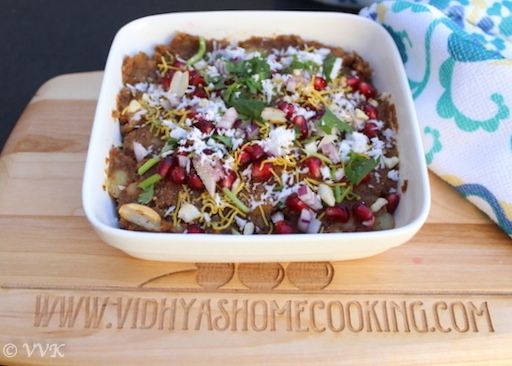 - Then add all the toppings or garnishing - I added grated coconut, sev, chopped onions, cilantro, crushed peanuts and pomegranate arils.