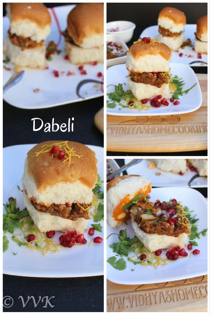 Dabeli is a popular snack and a famous street food from the state of Gujarat. (Wiki mentions that the recipe originated in the Kutch region of Gujarat) It is the Indian burger filled with potato filling and topped up with masala peanuts, pomegranate seeds and sev. Dabeli a mixture of all different tastes and it is a yummy and a filling recipe. It is tangy, it is spicy, it is sweet, and it is pungent too because of the garlic chutney.