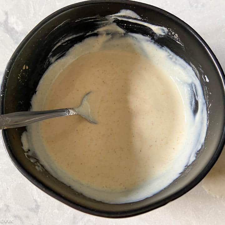 - Please check the blog post for making urad dal flour at home. If using store-bought flour, dry roast it for 30 seconds and cool before adding the yogurt.