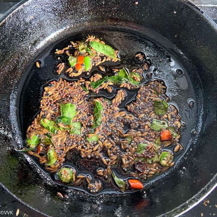 - Now in a separate tadka/tempering pan, heat the oil. When the oil is hot, add mustard seeds, cumin seeds, green chilies, and curry leaves.