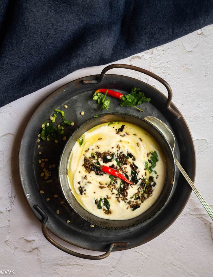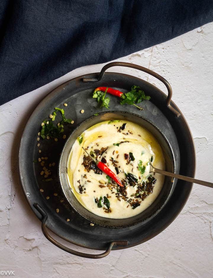 In Tamil, we call raita, pachadi. Today’s recipe, the dangar pachadi, is a very popular recipe from the Tanjore region of Tamil Nadu. If the urad dal powder/flour (Ulutham maavu) is ready, you can prepare this raita within 10 minutes. Yes, it’s that simple. All you need to do is mix the urad dal flour and yogurt, add salt as required, and prepare the tempering. That’s it.