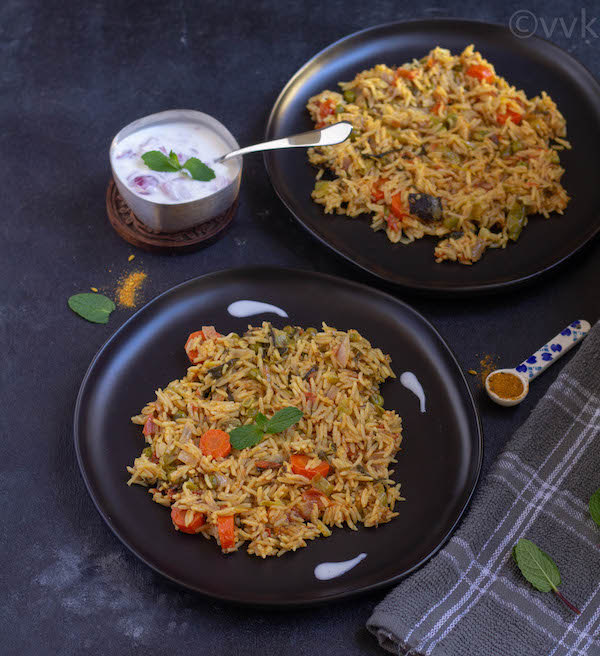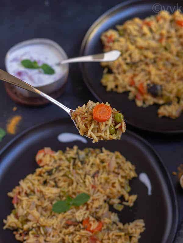 - Let the biryani to cool for 5 minutes and fluff it with a fork. Serve hot with raita.
