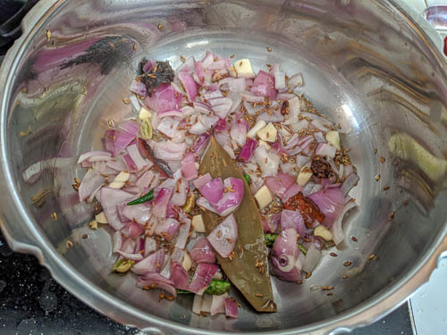 - When the oil is hot, add cumin seeds, bay leaf, cinnamon, black cardamom, green cardamom, and cloves — Fry for 30 seconds.