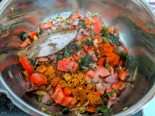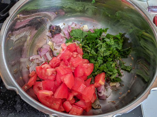 - Then add the tomatoes, mint leaves and cilantro. Cook for about 3 to 4 minutes or until the mint leaves wilt.