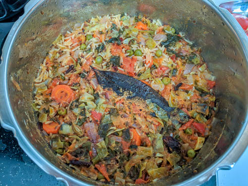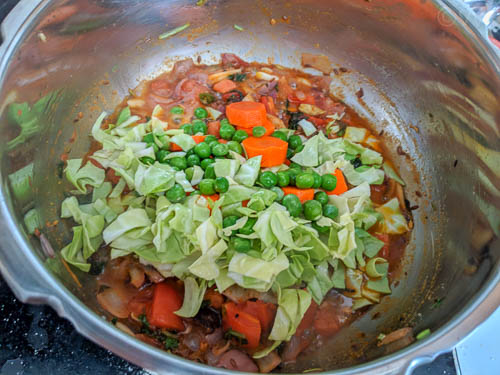 I got the idea of including cabbage and achari ghost masala from this video. Luckily, I was able to source the achari ghost masala (I used the Shan brand, and the masala is entirely vegetarian) and I used it instead of pickles. But I increased the oil quantity though.