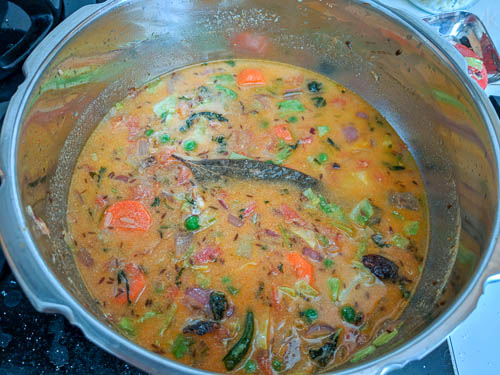 - Close the pressure cooker and put the weight on and cook for one whistle.