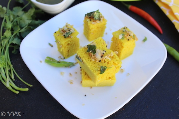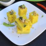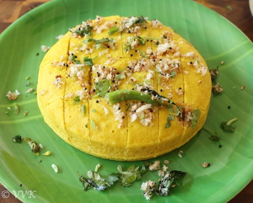 Khaman Dhokla is a popular Gujarati snack prepared with chick pea flour. It is spiced up with ginger and green chillies and tempered with sesame seeds, coconut and green chillies!
