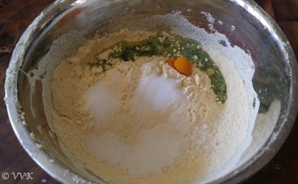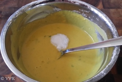 - In a wide bowl, take the sieved besan flour and add the turmeric powder, ginger-cilantro-chili paste, citric acid, sugar, salt, baking soda.
