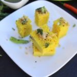 Khaman Dhokla is a popular Gujarati snack prepared with chick pea flour. It is spiced up with ginger and green chillies and tempered with sesame seeds, coconut and green chillies!